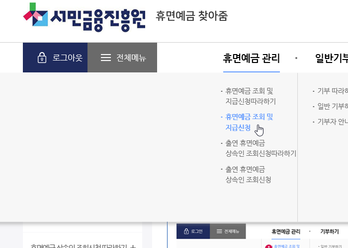 로그인을 완료하면 상단 '휴면예금 관리' 메뉴에서 '휴면예금 조회 및 지급신청' 메뉴를 클릭해줍니다. 혹시 사용법을 먼저 보고 싶으시다면 바로 위 '휴면예금 조회 및 지급신청따라하기' 메뉴를 보면 진행 방법을 미리 배울 수 있습니다.