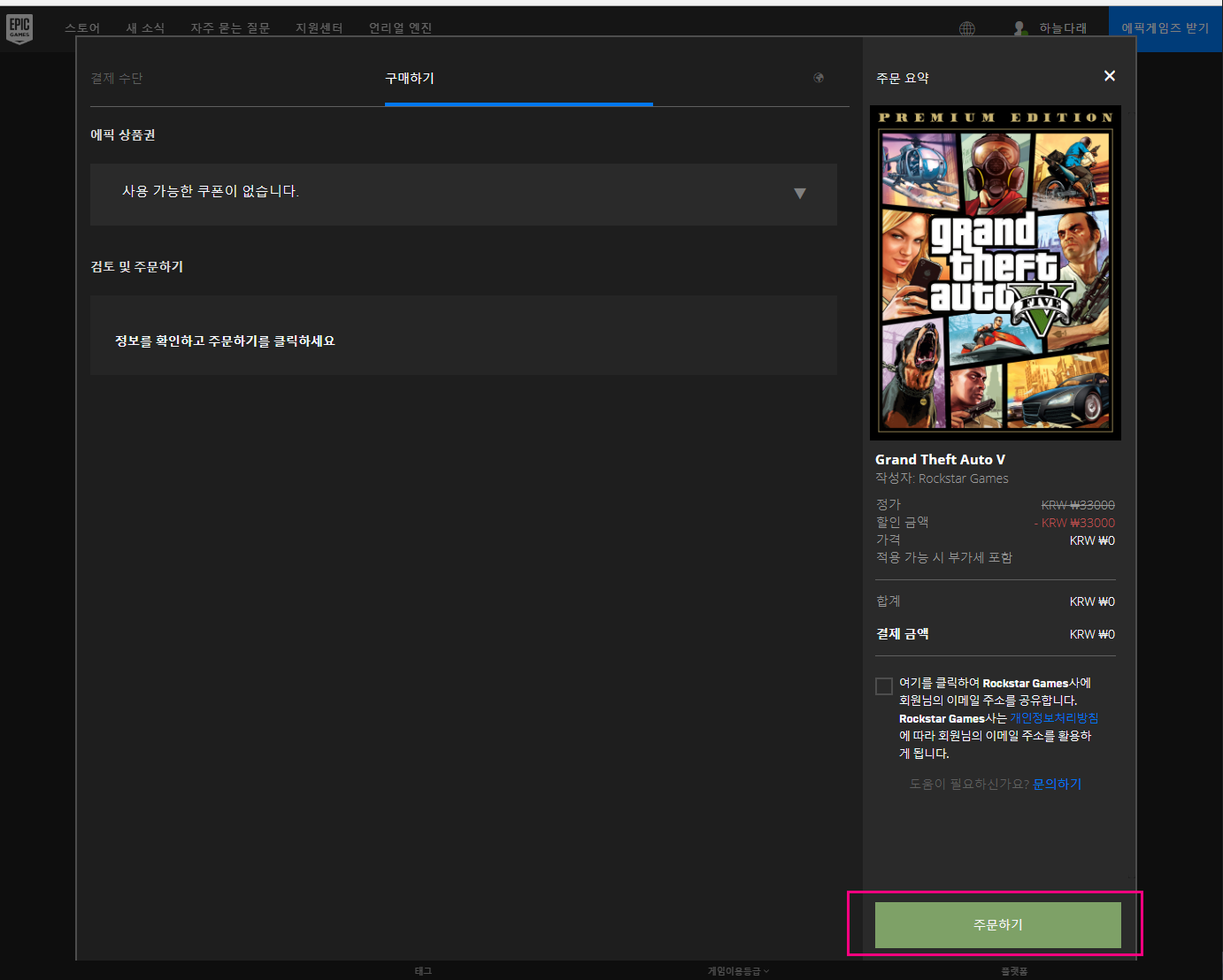 구매페이지로 이동 되는데, 이메일로 구매 내역 전송 옵션 체크하고 '주문하기' 클릭!