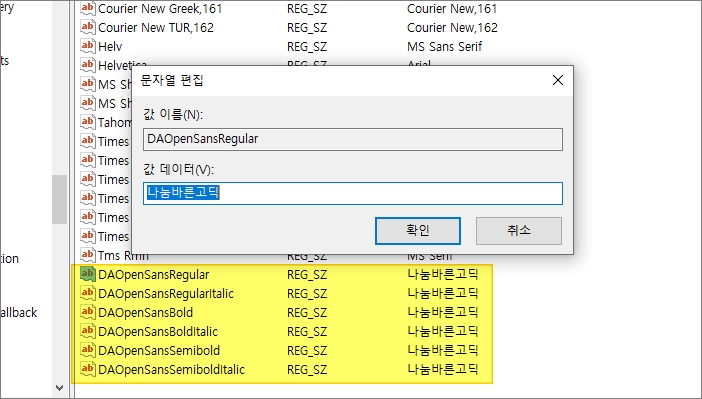 키가 생성되면 더블클릭해서 문자열 편집 창을 열고 값 데이터에 텔레그램 폰트로 변경하고 싶은 이름을 넣어주면 됩니다. 맑은고딕도 많이 쓰시는데, 이 경우, '맑은 고딕'으로 중간에 띄어쓰기를 해줘야 합니다. 오늘자 텔레그램(4.6.1 버전) 기준으로는 아래 이름으로 문자열을 만들고 각각 변경해주면 됩니다.
