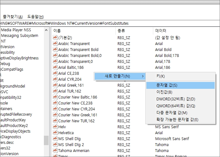 레지스트리 편집기에서 위 경로로 이동하면 각종 정보가 있는데, 여기서 원하는 값을 등록하면 됩니다. 오른쪽 화면에서 '마우스 우클릭 ▷ 새로 만들기 ▷ 문자열 값' 을 선택합니다. 문자열 값에는 log.txt 에서 확인한 폰트명을 입력해서 키를 만들어줍니다.