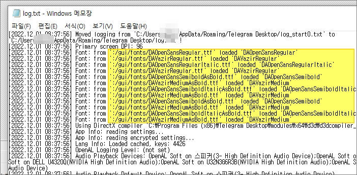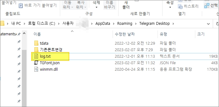 탐색기를 열어서 텔레그램 앱데이터 폴더 (%appdata%\Telegram Desktop) 로 이동 후, log.txt 파일을 열어 변경 사항을 체크합니다.
