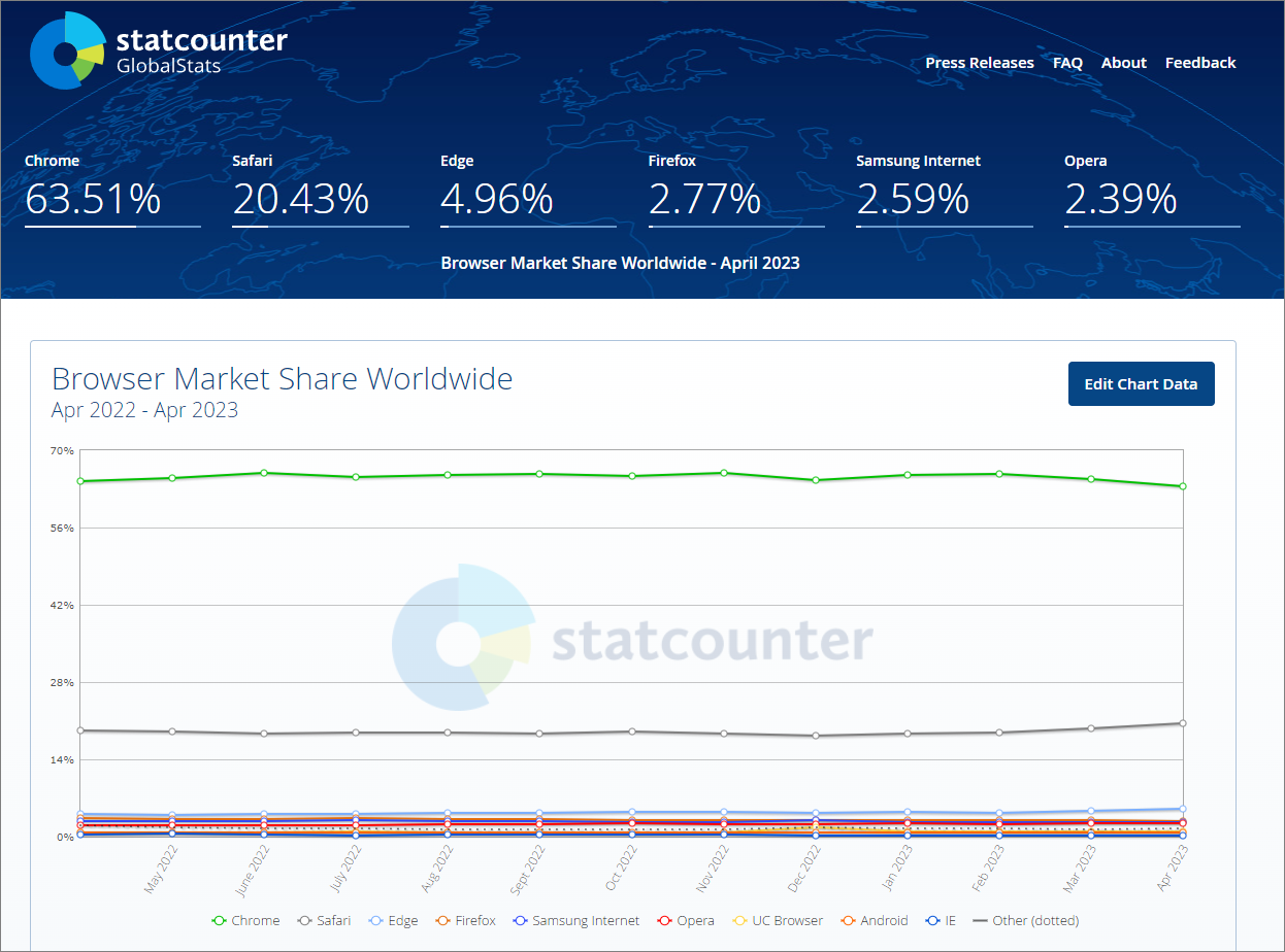 2022년 4월부터 2023년 4월까지 1년간 웹브라우저 점유율을 보면 크롬이 63.51%, 사파리가 20.43%, 엣지가 4.96%로 1~3위를 차지하고 있고, 다음으로 파이어폭스, 삼성인터넷, 오페라 등으로 이어지고 있습니다. 당연한 얘기지만 네이버 웨일 등은 전혀 보이지 않고 있습니다.