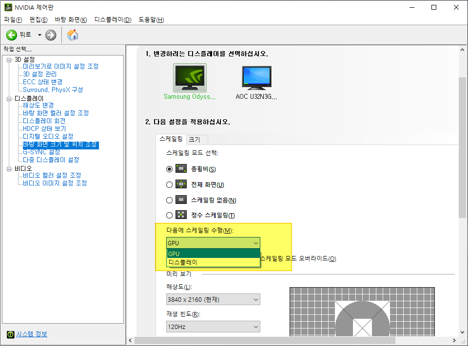 2. 디스플레이 > 바탕 화면 크기 및 위치 조정 > 스케일링 탭 > 다음에 스케일링 수행 > 디스플레이에서 'GPU'로 변경