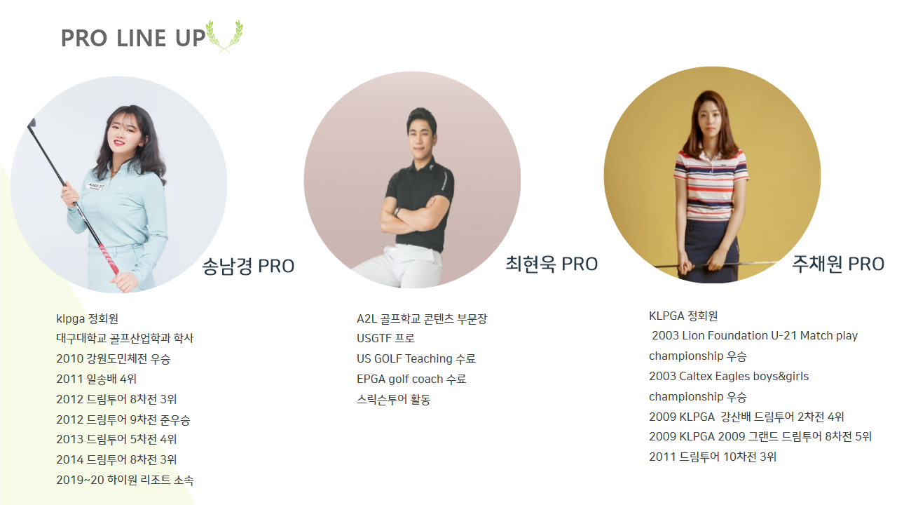 채영주, 송남경, 김채원, 오세웅, 주채원, 김진주, 정수정, 최현욱, 최윤선, 신은정 프로 등 실전 코칭을 해줄 수 있는 여러 프로분들로 프로그램이 운영됩니다.