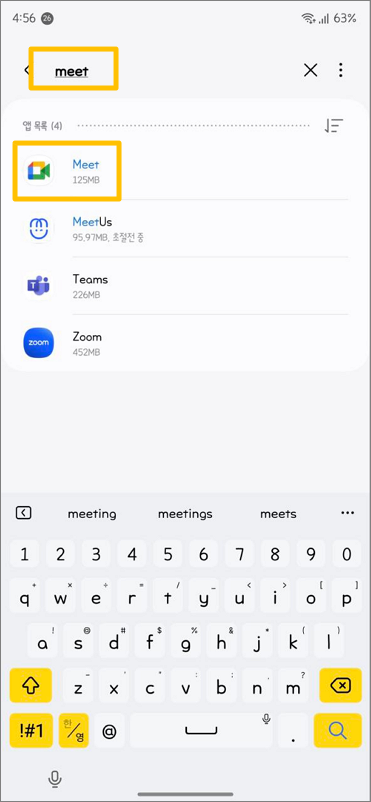 두 번째, 구글 Meet 앱을 직접 찾거나 위쪽에 'meet' 이라고 검색해서 [Meet] 앱을 선택합니다.